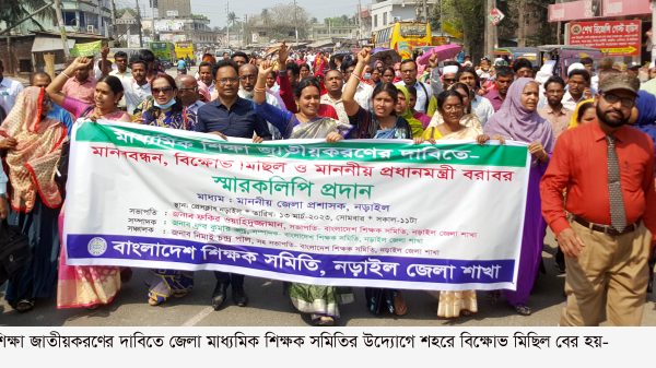 শুভ সরকার নড়াইল থেকে ॥ মাধ্যমিক শিক্ষা জাতীয়করণের দাবিতে নড়াইলে শিক্ষকদের মানববন্ধন, বিক্ষোভ মিছিল ও প্রধানমন্ত্রী বরাবর স্মারকলিপি পেশ করেছে। সোমবার (১৩ মার্চ) বেলা ১১টায় বাংলাদেশ শিক্ষক সমিতি নড়াইল জেলা